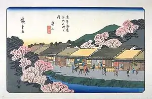 Utagawa Hiroshige's ukiyo-e print of Moriyama-juku dates from 1835 -1838. The print depicts a placid scene in the post station with several open-fronted buildings facing the Yasugawa River. Mount Mikami is shown in the background, as the setting in spring, with many sakura trees in full bloom. Each building has a different style of roof. On the right, a waitress tries to entice travelers into a tea house, but a peddler, man on a packhorse, and porters with a kago (palanquin) pass by. The middle tea house appears marginally more successful, as one person is seated on the verandah.