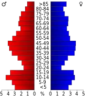 In the county, the population was spread out, with 25.20% under the age of 18, 5.60% from 18 to 24, 23.90% from 25 to 44, 24.30% from 45 to 64, and 21.00% who were 65 years of age or older. The median age was 42 years. For every 100 females there were 97.00 males. For every 100 females age 18 and over, there were 93.30 males.