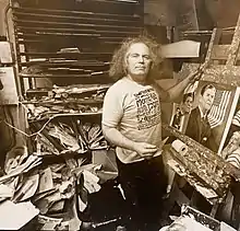 In 1949, Morris moved to the United States and worked as a carpenter while pursuing his art.[1] He began using a palette knife instead of brushes while working on his unpublished Dictionary of Color in 1956 and later experimented with rags before turning to toilet tissue, using almost 10,000 rolls per year for his paintings.[4]