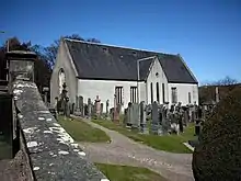 The burial ground, which has been extended and is still in use,[7] is also included within the designation. It is irregularly shaped and surrounded by rubble walls with spear-head railing, and contains tombstones dating from the seventeenth, eighteenth, nineteenth and twentieth centuries.[2] Amongst these are a number of Commonwealth war graves from the first and second world wars.[8]