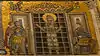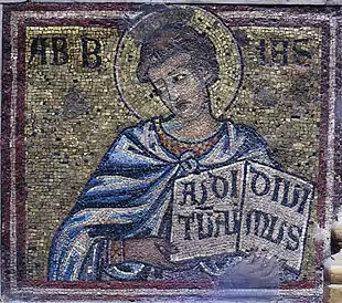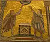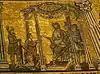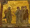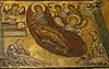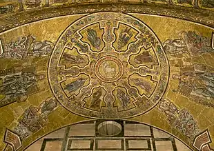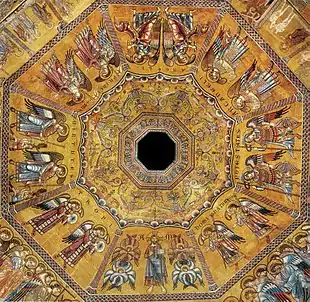 The last part of the interior to have mosaics added were the women's galleries between approximately 1300 and 1330.[1] These show angels and saints and their style agrees with Giovanni Villani's written evidence, which dates their completion to 1330 and probably dates the start of work to around 1300–1315. There are no art historical studies specifically on the mosaics of the women's galleries, though Venturi briefly notes that they were produced after 1300. The vault has a central motif of a starry sky, symbolic of the Empyrean, surrounded by angels with unclear attributes, possibly another set of angelic hierarchies.