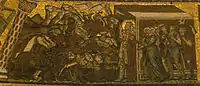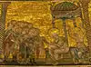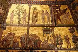 ![]() | Noah and the Animals Enter the Ark | Double scene, showing a certain modernity in the animals. Ponticelli attributed it to a 1483–1499 intervention by Alesso Baldovinetti, inspired by Paolo Uccello's frescoes Scenes from the Life of Noah in the Chiostro Verde of Santa Maria Novella. Roberto Longhi instead argued the mosaic was earlier than the fresco, with the latter drawing on the former. Soulier noted Egyptian or Syriac influence. |