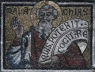 Above is a vegetable motif with a small head in the middle and higher up an angel holding the large central medallion, in which is written "Agnus Dei". Around the medallion is inscribed "HIC DEUS EST MAGNUS MITIS QUEM DENOTAT AGNUS" ("here is great God shown as a mild lamb") in gold letters on a red background. Between the rays are eight full-length depictions of prophets in Byzantine style with name labels at their feet – anticlockwise these are Moses, Abraham, Isaac, Jacob, Daniel, Ezekiel, Jermiah and Isaiah.