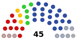 Political groups | Government (26) United Russia (20) "My Moscow" (5) Independent (1) Opposition (19) CPRF (9) Yabloko (5) SRZP (3) Independent (2) |
