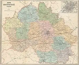 Moscow Governorate, together with seven other governorates, was established on December 29 [O.S. December 18], 1708, by Tsar Peter the Great's edict.[1] As with the rest of the governorates, initially, neither the borders nor internal subdivisions of Moscow Governorate were defined; instead, the territory was defined as a set of cities and the lands adjacent to those cities.[2] Later, Moscow Governorate was subdivided into 13 uyezds.