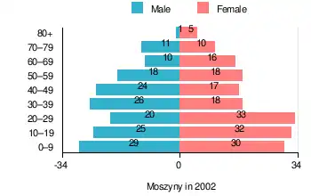 According to the 2002 Poland census, there were 343 people residing in Moszyny village, of whom 47.8% were male and 52.2% were female. In the village, the population was spread out, with 30.3% under the age of 18, 38.5% from 18 to 44, 17.8% from 45 to 64, and 13.4% who were 65 years of age or older.[1]