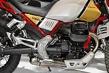 The engine is, typical for Moto Guzzi, an air-cooled longitudinal 90° V-twin Four-stroke engine. It features two valves per cylinder, which are controlled by one central camshaft via push rods and rocker arms. The intake valve is made of Titanium, which allows for a sharp camshaft profile due to its low weight. Fuel is injected electronically and the air intake is controlled by a central Throttle body, with a diameter of 52 mm. The throttle body is operated electronically (i.e. Ride by wire), allowing for different response settings. The engine generates 59 kW (80 PS) at 7750/min from its displacement of 853 cm³ and a compression ratio of 10,5:1. Maximum Torque is 80 Nm at 5000/min, while over 70 Nm are available between 3500/min and 8000/min.[3][4] The power is transmitted to the rear wheel via 6-gear transmission and a shaft drive. The Shaft drive is unique to the V 85 TT, which is the only middleweight adventure bike to feature it (as of April 2019). The motorcycle is homologated to the Euro-5 emission standard and has a fuel consumption of 4,9 L /100 km according to the WMTC cycle, which equals 118 g CO2 per kilometre.