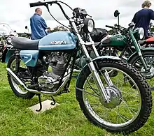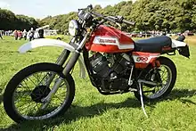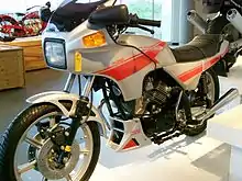 The engine featured Heron heads,[11] which were milled flat and the combustion chamber is recessed in the piston crown, aiding combustion and returning excellent fuel economy. A fuel consumption test by Motorcycling Monthly at Britain's Motor Industry Research Association in 1976 returned a performance of 65 miles per imperial gallon (4.3 L/100 km; 54 mpg‑US) while a 3½ bike carried rider and pillion passenger.[12] The engine also incorporated one piece forged steel crankshaft, ball main bearings (first series motors), plain big end bearings (second series motors), and the conrods run on a common pin, desaxe, and offsetting the rear cylinder to the front by 50 mm (2.0 in). Front and rear barrels and heads are interchangeable. VBH Dell'Orto (25 mm VHB 25 BS) square slide carburettors were fitted to the 350, with air fed via air-box with two filters.[11] Bore and stroke was 62 mm × 57 mm (2.4 in × 2.2 in), respectively.[11] The camshaft was driven by a small toothed belt, and was a revolutionary advance. They also included an electronic capacitor discharge ignition system designed by Ducati Elettronica. Early models had kick-start only but later ones also included a starter motor using three centrifugal friction shoes engaging the alternator rotor cover. The CDI ignition was powered by a coil in the alternator and using the kick-start a bike could be started and ridden with a flat battery.