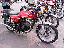 In the early 1970s, Moto Morini launched their first 72° V-twin engined motorcycles, designed by Franco Lambertini, and created by Franco and Gino Marchesini.[9] The 350 Sport and Strada models displaced 344 cc and were complemented in 1977 by 500 cc Sport and Strada models. Equipment on the models was of high-spec and when released the Morini 3½ was around the same price as a Honda CB750.