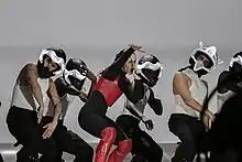 The stage design is intended to deliver a "minimalistic" and "immersive" experience incorporating the motorcycle aesthetic of the record. The on-stage activity, which pretends to approximate every single audience member to the stage through mobile cameras handed by the performer and a selected amount of dancers.[13] In resemblance to her Motomami Live TikTok concert that took place on 17 March, six Panasonic PT-RZ31K cameras, if not a steadicam, follow Rosalía during a major part of the show, projecting what happens onstage on both screens in a TikTok-ish recording manner, also enriching the experience of visualizing the concert from the grandstand.[14] The presence of a cameraman often sparked controversy. Rosalía later told the Recording Academy that she "figured there had to be a huge camera to make the audience feel. I understand people expected fireworks, but the craziest thing for me is dancing and expressing myself. I'm at a point where I want to put all my effort into having the best voice, put all the best choreography. That's what's important to me".[15]