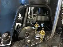 The fuel pump is mounted above the cylinder head and driven by the camshaft,[21] the air-blast pump is cast onto the cylinder and driven via a lever by two connecting rods from the engine's piston rod.[26] Like all air-blast injected diesel engines, the Motor 250/400 has a compressed gas bottle for the injection air. It is made of welded steel, and also used for starting the engine (compressed air starting). For safety reasons, the engine was fitted with several safety valves,[27] and had some of its tubes designed for gases filled with pebbles and wire wool.[28][8] The engine was designed for kerosine, but could also burn several other types of fuel, including petrol, oils, and mains gas.