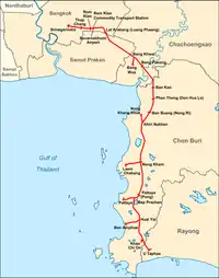 The Bangkok−Ban Chang Motorway (Thai: ทางหลวงพิเศษกรุงเทพมหานคร−บ้านฉาง, RTGS: Thangluang Phiset Krung Thep Maha Nakhon−Ban Chang), designated Motorway Route 7, is a motorway in Thailand, connecting Bangkok to Chonburi, Pattaya, and Map Ta Phut. The country's first intercity motorway, it is part of the Asian Highway Network as AH Route 19 and AH Route 123. The entire length from Bangkok to Pattaya is 125.865 kilometres (78.209 mi) and the posted speed limit is 120 kilometres per hour (75 mph), enforced primarily by speed cameras. An extension between Pong and Map Ta Phut opened in May 2020.[1] It is part of the transport network development project in the eastern seaboard.