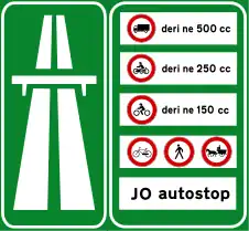The motorways in Albania (Albanian: Autostrada or Autoudhë) are the controlled-access highway system in Albania predominantly under the supervision of the Ministry of Infrastructure and Energy. The motorways are characterised as roads with at least two lanes in each driving direction including an emergency lane and a maximum allowed speed limit of not less than 110 kilometres per hour (68 mph).[1]