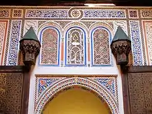 The douiria or apartment is located on the upper floor of the house and is reached via a short staircase. This leads to a square salon covered by a wooden ceiling with a central skylight. On two sides of the salon, facing each other, are large alcoves which served as seating areas and are sheltered by their own wooden canopies or ceilings. The two other sides of the salon have large doorways leading to side rooms which might have been used as bedrooms or secondary salons.[2][1] The main central room is particularly rich in decoration, with carved stucco featuring geometric patterns and Kufic letter motifs as well as sculpted and painted wooden ceilings.[1][2] The side rooms also have painted ceilings, featuring motifs from the time of Sultan Moulay Ismail (late 17th to early 18th century).[2]