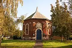 The 1722 chapel of St James, by William Sands senior of Spalding, was a rebuild of an earlier chapel, and was enlarged in 1886. In 1896 Moulton Chapel became a separate ecclesiastical parish under the name of Moulton St James.[3] Pevsner notes the church as a red-brick octagon with a chancel added in 1886, and a domed interior. The style is Dutch, influenced by late 17th-century fen drainers. There is a marble font, and a west gallery probably from the 19th century.[4] St James' is a Grade II* listed building.[5]