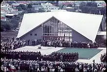 The Mount Albert shops flourished in the 1950s and 1960s.[38] During the 1960s, Mount Albert had a significantly older population than the surrounding areas of Auckland.[39] In April 1961, the Mount Albert War Memorial Hall, a large modernist community centre, was constructed.[40] Urban Māori and Pasifika communities grew in the area from the 1950s onwards, and increased in the 1970s due to the gentrification of the inner city suburbs close to the Auckland city centre.[41] The Mount Albert shopping village began to go into a decline in the 1970s, after the establishment of the St Lukes Shopping Centre to the north.[42]