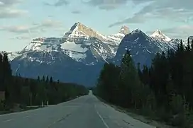 ![]() Mount Christie centered above the Icefields Parkway with Brussels Peak to its right and Mount Lowell furthest to right | |
