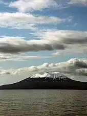 Mount Edgecumbe (Russian: Эджком) is located at the southern end of Kruzof Island, Alaska, about 15 miles (24 km) west of Sitka. The dormant volcano is about 9.9 miles (16 km) east of the Queen Charlotte Fault that separates the North American and Pacific Plates, and is the highest point in the Mount Edgecumbe volcanic field, an area of about 100 square miles (260 km2) on Kruzof Island that also includes Crater Ridge and Shell Mountain.[4]