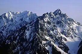 Mount Hotaka (穂高岳, Hotaka-dake), also known as Mount Hotakadake, is one of the 100 Famous Japanese Mountains as coined by the media, reaching a height of 3,190 m (10,466 ft). Mount Hotaka is situated in Japan's Hida Mountains and all its major peaks except Mount Maehotaka, lie on the border between the cities of Matsumoto, Nagano Prefecture, and Takayama, Gifu Prefecture. This mountain is located in Chūbu-Sangaku National Park.[2]