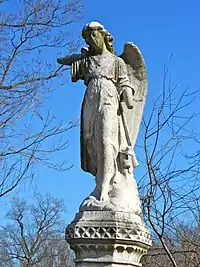 A Norman Castellated brownstone gatehouse[6] designed by Stephen Decatur Button[7] was built at the entrance on Islington Lane, today known as Kingsessing Avenue. A single gated arch was topped with an imposing statue of Father Time. The statue was purchased, removed from the gate and placed atop the grave of John H. Jones,[8] the former president of the Mount Moriah Cemetery Company.[9]