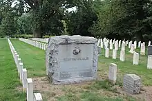 Mount Moriah is a part of the United States National Cemetery System.[19] In 1864, the United States Federal Government purchased two parcels of land within Mount Moriah Cemetery. The Soldiers' Lot on the Philadelphia side of the cemetery was purchased for soldiers who died at local military hospitals and contains 404 Union Army soldiers. The lot initially included the remains of six Confederate soldiers,[20] however in 1885 all but two were reinterred at Philadelphia National Cemetery.[21] The Naval Plot on the Yeadon side of the cemetery is ten acres in size and was purchased for the reinterment of bodies previously buried at the U.S. Naval Home. The Naval Plot today contains 2,400 U.S. Navy officers and seamen.[10]