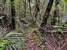 There are numerous tracks to the summit.[17] All the tracks are well signposted, with bright orange plastic waymarks[18] and near the summit have recently been laid with boardwalks (see photo below), some of them as part of Te Araroa long distance trail.[19] A lookout platform was built on Pirongia summit after 1999.[6] From it, it is possible to spot Mount Taranaki summit and Mount Ruapehu summit on a clear day (see sunset photo). On the west side there are Aotea, Kawhia and Raglan harbours.[18]