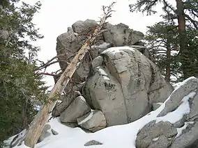 The Mount San Jacinto State Park encompasses the weathered granite summit of Mount San Jacinto, which at 10,834 feet (3,302 m) above sea level[3] makes this the second highest peak and mountain range in Southern California. It is accessible by the Palm Springs Aerial Tramway and lies on the Pacific Crest Trail.