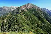 Mount Sannosawa (三ノ沢岳, Sannosawa-dake) is amongst the Kiso Mountains, located in the Kiso District, Nagano Prefecture, in the Chūbu region of Japan. It is 2,846 m (9,337 ft) tall. It is composed of Granite, and has a 120 m (394 ft) long 30 m (98 ft) wide cirque covered in dense vegetation, mainly pine trees.[1] There is the "Sannosawa cirque". Glacial expansion has created a gully, just underneath the cirque.[1] A lot of Alpine plant grow naturally. Name River and Ina River (Tributary of Kiso River) that become the sources flow to the Ise Bay of Pacific Ocean. There is the tributary called "Sannosawa" around Mount Sannosawa. Komagatake Ropeway is used to climb.[2]