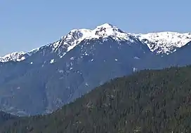 Mount Thyestes is a 1,697-metre (5,568-foot) mountain summit located in the Tantalus Range, in Tantalus Provincial Park, in southwestern British Columbia, Canada. It is situated 4 km (2 mi) immediately west of Brackendale, 7 km (4 mi) northwest of Squamish, and 10.7 km (7 mi) southeast of Mount Tantalus, which is the highest peak in the Tantalus Range. Its nearest higher peak is Omega Mountain, 2.4 km (1 mi) to the northwest, and Mount Pelops lies 3.6 km (2 mi) to the west-northwest.[3] Precipitation runoff from the peak drains into tributaries of the Squamish River. The first ascent of the mountain was made in 1942 by R. McLellan, H. Parliament, and F. Roots.[1] The mountain was named for Thyestes, son of Pelops and grandson of Tantalus according to Greek mythology.[1] The mountain's name was officially adopted on June 6, 1957, by the Geographical Names Board of Canada.[2]