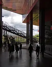 The parking garage contains parking spots for 480 cars. The space has up to 16 m high ceilings, and the underside of each level of apartments is covered in aluminum painted in a distinctive colour scheme of psychedelic hues which, as a tribute to Danish 1960s and '70s furniture designer Verner Panton, are all exact matches of the colours he used in his designs. The colours move, symbolically, from green for the earth over yellow, orange, dark orange, hot pink, purple to bright blue for the sky.[2] Besides being a sloping podium for the residential units to sit on, maximizing sunlight and views, the central garage space also serves as an atrium containing the building's circulation, affording the only access to the apartments. A set of metal stairs climb through the main space over the parking lot, providing access to the hallways across suspended industrial-looking metal-clad concrete connections, while a Swiss-manufactured, ski lift-style inclined elevator moves along the wall of the garage. Each level's hallway is enclosed and encased in painted metal both on the interior and exterior, colored according to floor in the same hues used in the main space.