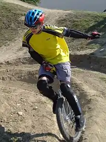 Mountain unicycling is an adventure sport that consists of traversing rough terrain on a unicycle. Mountain unicycling (muni) is undertaken on similar terrain to mountain biking. However, muni requires much more attention to the microfeatures of the short distance in front of the wheel.[1] Unicycles' lack of a freewheel means that descents must be controlled all the way, and the typical lack of a gear system (though two-gear hubs are available) prevents the rider from reaching high speeds. Muni usually takes place on specially designed unicycles, which are equipped with strong hubs, large, knobbly tires, high-grip pedals and rugged frames.[2] Some are also equipped with rim or disc brakes, having the lever mounted under the nose of the saddle. The brake primarily helps to compensate the downhill-slope force, while more expert riders also use it to decelerate or stop.[3]