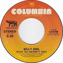 "Movin' Out (Anthony's Song)" is a song written and recorded by Billy Joel originally appeared on his 1977 album The Stranger as its opening track. The track details the singer's disgust with the upwardly mobile bourgeois aspirations of working- and lower-middle-class New Yorkers who take pride in working long hours to afford the outward signs of having "made it".[3] Characters have blue-collar jobs, and Joel considers their rejection of their working-class roots (trading a Chevy for a Cadillac and buying a house in Hackensack, New Jersey) ultimately futile. Near the end of the recording is the sound of a car starting up and driving away; the bass player Doug Stegmeyer's 1960s Corvette was used.