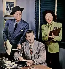 ![]() The cast in 1947. From left: Len Doyle (Harrington), Jay Jostyn (the District Attorney), and Vicki Vola (Edith Miller) | |