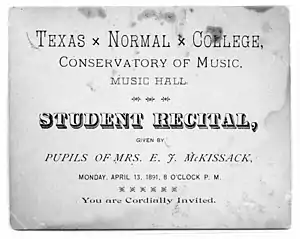 Eliza Jane McKissack (née Eliza Jones Aykroyd 11 December 1828, in New Bern, North Carolina[1] – 15 January 1900, in Nashville, Tennessee) was a music teacher who, in 1890, became the founding head of music at the University of North Texas College of Music, then called Normal Conservatory of Music,[2][3] part of Texas Normal College and Teacher Training Institute, which was founded in 1890 as a private institution. The College of Music, today, is a comprehensive school with the largest enrollment of any institution accredited by the National Association of Schools of Music.[4] It is the oldest (and first) in the world offering a degree in jazz studies. Since the 1940s, the College of Music has been among the largest in the country.[5]