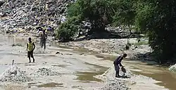 Msimbazi River bed being exploited for sand and used a trash dump in backgorund
