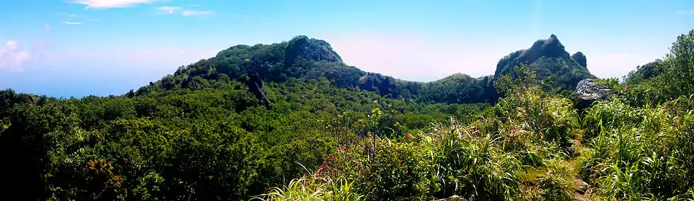 At 1,614 metres (5,295 ft) above sea level, Mount Timpoong is the highest peak of Mount Mambajao. Mambajao is the central and largest of the island's three volcanic mountains (the others being Mount Catarman and Mount Sagay, also known as Mount Guinsiliban). Mount Mambajao's other peaks are Mambajao Peak at 1,568 metres (5,144 ft) above sea level, and an unnamed peak with an elevation of 1,529 metres (5,016 ft). It has flank vents located on Campana Hill and Minokol Hill.[4][1]
