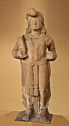A statue of Mudgarpani ("Mace-holder") Yaksha from Bharana Kalan, visible in the Mathura Museum, is dated to circa 100 BCE.[11] It was discovered in Bharana Kalan, 32 kilometers northwest of Mathura.[11] In the right hand he holds a mudgar mace, and in the left hand he used to hold the figure of a small standing devotee or child joining hands in prayer.[12][2][6]