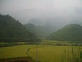 ![]() Rice fields in a valley in the Mufu Range, seen from National Highway 106 east of Tongshan | |