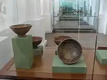 The Muisca were notable for their ceramics production and major production was located close to rivers and lakes. The surroundings of Lake Fúquene formed a principal place for ceramics production, especially in Ráquira and Tinjacá. The Spanish called the people from this region "Pottery People".[23] Other important clay and ceramic producing settlements were Soacha, Cogua, Guatavita, Gachancipá and Tocancipá on the Bogotá savanna and Tutazá, Ráquira, Sutamarchán (Boyacá) and Guasca and Suesca to the north of the flat plains.[24][25] The production of pottery was the task assigned to the Muisca women who produced various ceramics such as anthropomorphic vases, cups and mugs, the typical bowls called múcura, pans, the large pots for salt extraction (gacha) and jars with two, four or six holds. The pots were decorated with colourful paints and stylilised serpent or frog figures.[24]