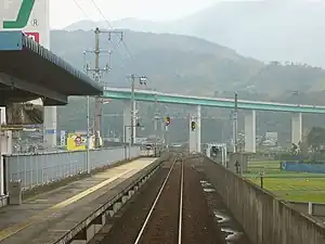 Mukaibara Station (向井原駅, Mukaibara-eki) is a passenger railway station located in the city of Iyo, Ehime Prefecture, Japan. It is operated by JR Shikoku and is a junction station with dual station numbers "S06" and "U06". From here the Yosan Line divides into 2 branches. The older, original, branch along the coast has since 2014 been referred to as the Beloved Iyonada Line (愛ある伊予灘線, Ai aru iyonada-sen). Stations along it use the "S" prefix. Stations on the newer Uchiko branch use the "U" prefix.[1][2]