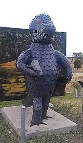 The sculpture of the Mulgildie Bunyip is on the roadside in Wattle Street (opposite Palm Street, 24°57′54″S 151°07′52″E / 24.96495°S 151.13109°E).[21] Tourists are encouraged to visit the Bunyip's watering hole approximately 10 minutes drive from Mulgildie, a place renowned for strange bubbling and churning waters and the subsequent disappearance of livestock.[22]