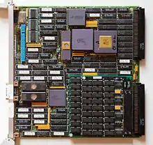 The Multibus specification was a robust industry standard with a relatively large form factor, allowing complex devices to be designed on it. Because it was well-defined and well-documented, a Multibus-compatible industry grew around it, with many companies making card cages and enclosures for it. Many others made CPU, memory, and other peripheral boards. In 1982 there were over 100 Multibus board and systems manufacturers.[2] This allowed complex systems to be built from commercial off-the-shelf hardware, and also allowed companies to innovate by designing a proprietary Multibus board, then integrate it with another vendor's hardware to create a complete system. One example of this was Sun Microsystems with their Sun-1 and Sun-2 workstations. Sun built custom-designed CPU, memory, SCSI, and video display boards, and then added 3Com Ethernet networking boards, Xylogics SMD disk controllers, Ciprico Tapemaster 1/2 inch tape controllers, Sky Floating Point Processor, and Systech 16-port Terminal Interfaces in order to configure the system as a workstation or a file server.[3] Other workstation vendors who used Multibus-based designs included HP/Apollo[4] and Silicon Graphics.[5]