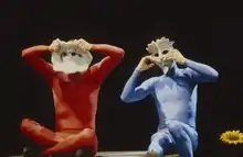 After studies with Jacques Lecoq in Paris and Roy Bosier in Rome, and following a three-year period of experimentation, the Mummenschanz Mask Theater was founded in 1972. In 1973, under the direction of producers Arthur Shafman and Robert B. D'Angelo, Mummenschanz toured the United States, Canada, Europe, and South America, and later enjoyed a 1,326-performance, three-year run on Broadway (1977–80).[2] In 1986, they performed their The New Show at the Helen Hayes Theatre in New York. During this time they were spoofed on Late Night with David Letterman by Chris Elliott.[3] They appeared as special guest stars on the last episode of the first season of The Muppet Show, which taped in November 1976.[4] The troupe won the Rose d'Or for their TV production La Pomme in 1980. They appeared on Sesame Street. They also appeared on 3-2-1 Contact in the 1980s and Northern Exposure in the 1990s. On Feb. 6, 1986 they appeared on The Tonight Show on NBC. In 1987, Mummenschanz performed in the award-winning music video for "Devil's Ball" by Double (featuring Herb Alpert on trumpet). In 1992, Andres Bossard, a founding member of the troupe, died at age 47 from AIDS-related complications.[5] Mummenschanz toured with American actor John Charles Murphy for the duration of Parade, their world tour beginning in 1995. Their next show was an anniversary programme called 40 years, and it presented the highlights of four decades of creative endeavors.[6] In December 2016, Mummenschanz began touring Switzerland with a new program titled "you & me", created by founding member Floriana Frassetto.