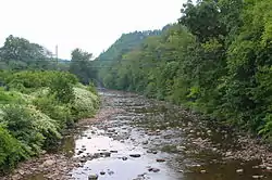 The mouth of Muncy Creek has an elevation of slightly less than 480 feet (150 m), while the source of the creek has an elevation of between 2,260 feet (690 m) and 2,280 feet (690 m).[10] The headwaters of the creek are more than 1,500 feet (460 m) higher than its mouth.[11] The headwaters of Muncy Creek are mountainous and are situated on the Allegheny Plateau.[11][12] The southern edge of the Allegheny Mountain runs from the creek west as far as Lock Haven or Pine Creek.[12] The valley of Muncy Creek is surrounded by scalloped hills.[13] Muncy Creek's course winds significantly, but flows generally southwest.[11]