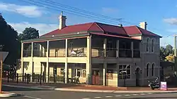 The hotel is a two storey Federation Free Style building and has landmark qualities. The first floor verandahs and balustrades still overhang the footpath and have not been removed as has been the fate of most of the hotels throughout the state. The verandahs wrap around the street frontage from Nichol Street to Jacoby Street, terminating at a projecting "residents" entry featuring narrow, arched windows and door. The corrugated iron roof is painted red and has a simple hipped form punctuated by two, relatively tall brick chimneys with decorative rendered mouldings.[18]