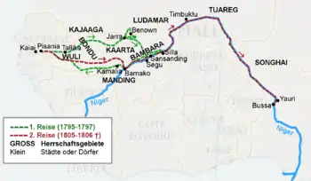 On 21 June 1795, he reached the Gambia River and ascended it 200 miles (300 km) to a British trading station named Pisania. On 2 December, accompanied by two local guides, he started for the unknown interior.[11] He chose the route crossing the upper Senegal basin and through the semi-desert region of Kaarta. The journey was full of difficulties, and at Ludamar he was imprisoned by a Moorish chief for four months. On 1 July 1796, he escaped, alone and with nothing but his horse and a pocket compass, and on the 21st reached the long-sought Niger River at Ségou, being the first European to do so.[12] He followed the river downstream 80 miles (130 km) to Silla, where he was obliged to turn back,[3] lacking the resources to go further.[13]