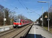 In 1967, Deutsche Bundesbahn began converting the section between Munich and Geltendorf for S-Bahn operations. Work on electrification of the section at 15 kV AC began in the summer of 1967. An overhead line of the Re 160 type (designed for operations up to 160km/h) was installed. Deutsche Bundesbahn began operating electric trains on local services between Munich and Geltendorf on 29 September 1968. The electrification reduced travel time from 78 to 40 minutes. In addition, Deutsche Bundesbahn replaced the mechanical signal box along the section by push-button relay interlockings and equipped the future S-Bahn stations with new 76 cm high and 210 m long platforms.[27] The Munich S-Bahn began operations on 28 May 1972 as line S4, with trains running every 40 minutes to Geltendorf.[28][29]