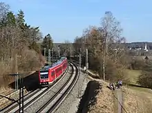 In order to accelerate traffic between Munich and Switzerland, the governments of Germany, Bavaria and Switzerland and Deutsche Bahn agreed on 20 April 2009 to upgrade the Munich–Memmingen–Lindau route, which included the electrification of the still non-electrified section of the Geltendorf–Buchloe route.[31] It was given planning approval on 31 August 2017; work on the electrification began on 23 March 2018.[32] Deutsche Bahn lowered the tracks under five road bridges at Schwabhausen, Kaufering and Igling to make room for the overhead line.[33] Between Kaufering and Buchloe, it equipped the line for bi-directional operation, finishing on 20 October 2018.[34] Noise barriers were erected in the course of the work in the vicinity of Schwabhausen, Igling and Buchloe.[35] Deutsche Bahn began scheduled electric train operations between Geltendorf and Buchloe on 13 December 2020.[36]