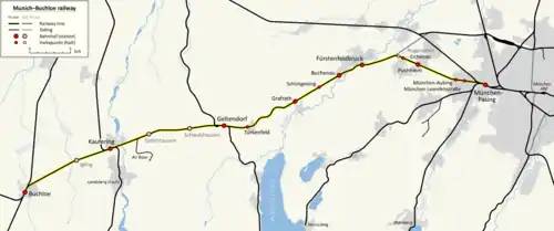West of Geltendorf station, the Munich–Buchloe line crosses over the line to Mering on a bridge and runs on a high embankment over the Weihergraben stream and continues on a largely straight route through a wooded area to Schwabhausen. Between Schwabhausen and Epfenhausen, the line turns back to the southwest. At the former Epfenhausen station, which is now only a junction, a siding connects to the now closed Landsberg-Lech Air Base. The line runs south through a two-kilometer-long and up to 15 metre deep cutting past Altkaufering and across the Lech on a 114 metre-long bridge. It runs over an embankment on the southern edge of Neukaufering to Kaufering station at kilometre 56.2, where the lines to Landsberg and to Bobingen branch off. The line climbs steadily to the north, past the Welfen barracks, and passes the village of Igling to the south and crosses the Singold. Running in a straight line over several railway embankments to the southwest, it reaches its highest point on the watershed between the Singold and Wertach at 621 metres above sea level.[41] Now descending, the line enters the local area of Buchloe and runs on a bridge over the Gennach. At the end of the bridge it turns south, meets the Augsburg–Buchloe railway coming from the north and the two lines run to Buchloe station, where they end at km 68.0. Buchloe is the starting point of the Buchloe–Lindau and Buchloe–Memmingen railways.[42][12]