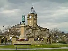 By 1848 there was a railway station in Batley, and in 1853 Batley Town Hall was erected. It was enlarged in 1905, and is in the Neoclassical style, with a corbelled parapet and pilasters rising to a centre pediment. In 1868 Batley was incorporated as a municipal borough, the former urban district of Birstall was added to it in 1937.[6]
